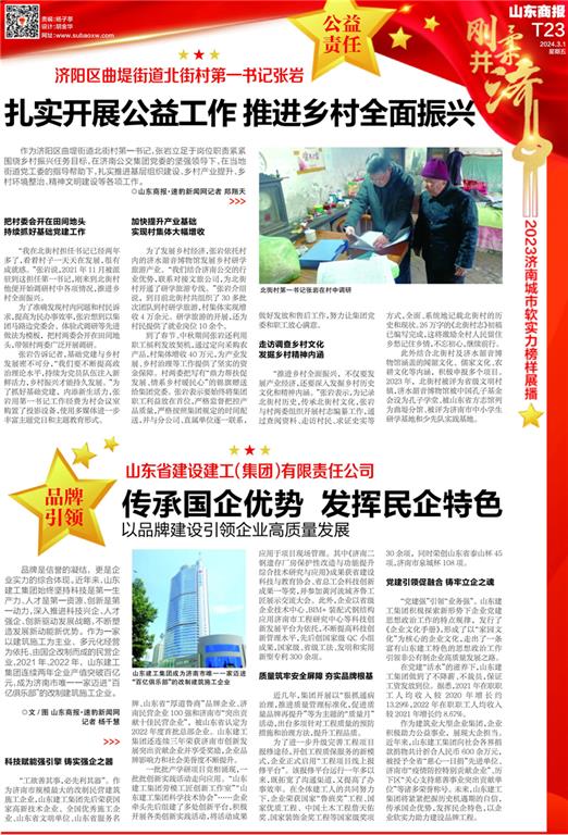 硬實力讓城市強大,軟實力讓城市偉大。3月20日下午,2023濟南城市軟實力榜樣頒獎盛典在山東大廈舉行。山東建工集團獲評2023濟南城市軟實力榜樣之“品牌引領榜樣”,企業(yè)先進事跡在《山東商報》上刊登。濟南市委宣傳部副部長、市文明辦主任孫世會;濟南市委宣傳部部務會成員王慶會;濟南市委政法委副書記,市法學會黨組書記、常務副會長卜海晶;濟南市中級人民法院副院長李會德;濟南市住房和城鄉(xiāng)建設局黨組副書記、副局長安紀文;濟南市民營經(jīng)濟發(fā)展局黨組成員、副局長燕軍等領導出席儀式。集團黨委副書記張方明代表集團上臺領獎,工會主席、黨群部部長欒兆偉參加活動。