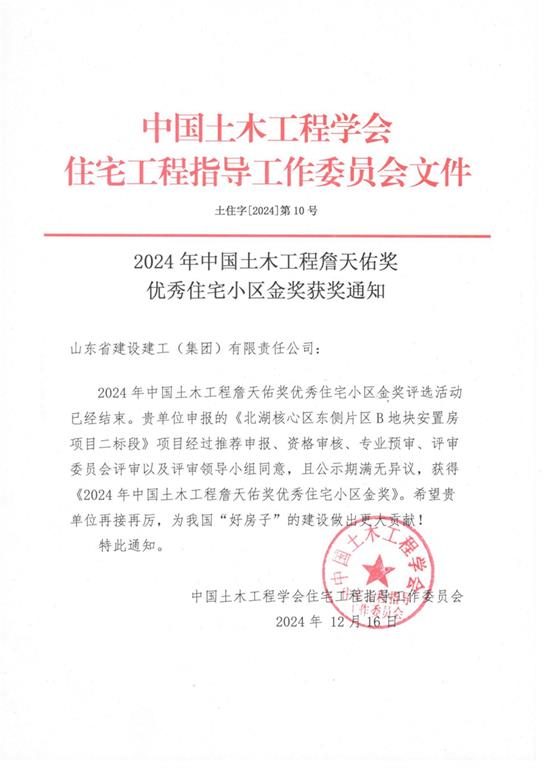 2024年12月,由山東建工集團(tuán)承建的北湖核心區(qū)東側(cè)片區(qū)B地塊安置房項(xiàng)目二標(biāo)段獲得中國土木工程詹天佑獎優(yōu)秀住宅小區(qū)金獎。今年全國共48個工程獲獎,集團(tuán)榜上有名。
