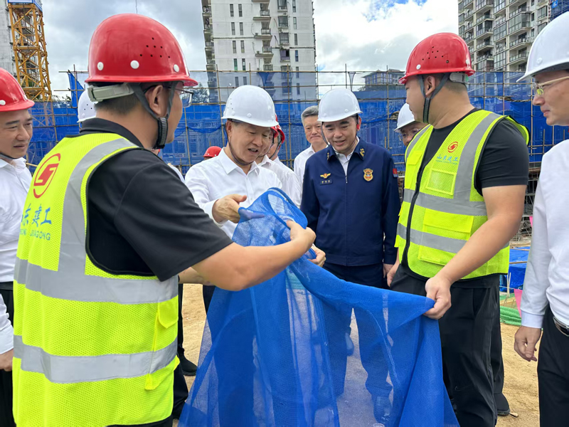 劉小明省長一行深入施工現場,實地考察項目建設、安全生產及企業生產經營狀況,重點對消防設施配備、危大工程管控及安全防護措施落實情況進行細致核查,逐一查驗內外架搭設規范性、密目網阻燃性能、消防水源保障與應急物資儲備等關鍵環節的實際狀況,并現場觀摩了外架密目網阻燃測試的實際操作演示。在聽取相關匯報后,劉小明省長對該項目安全生產、文明施工、工程組織給予了高度評價;并要求省、市、縣相關主管部門提供政策支持與技術指導,助力項目順利推進。